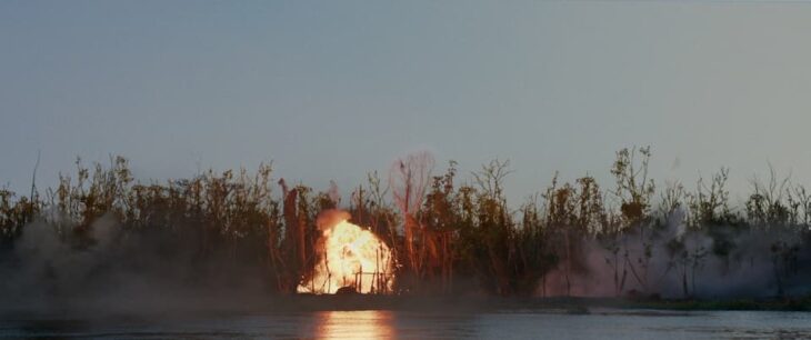 首まで水に浸かった女性兵士が銃を構えながら川を渡る。近くには死体が浮いている。そこはベトナム戦争の最前線だ。